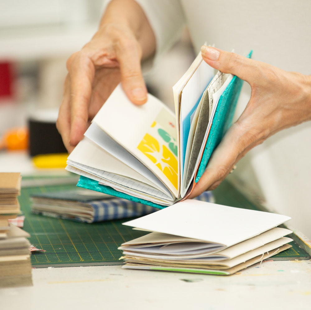 Varje föremål är skapat av det som råkar finnas till hands: papper som haft ett tidigare liv, trådar med sina egna historier, små bitar av vardag förvandlade till något att bära med sig eller skriva sig hem i. Återvunnet och återfunnet.