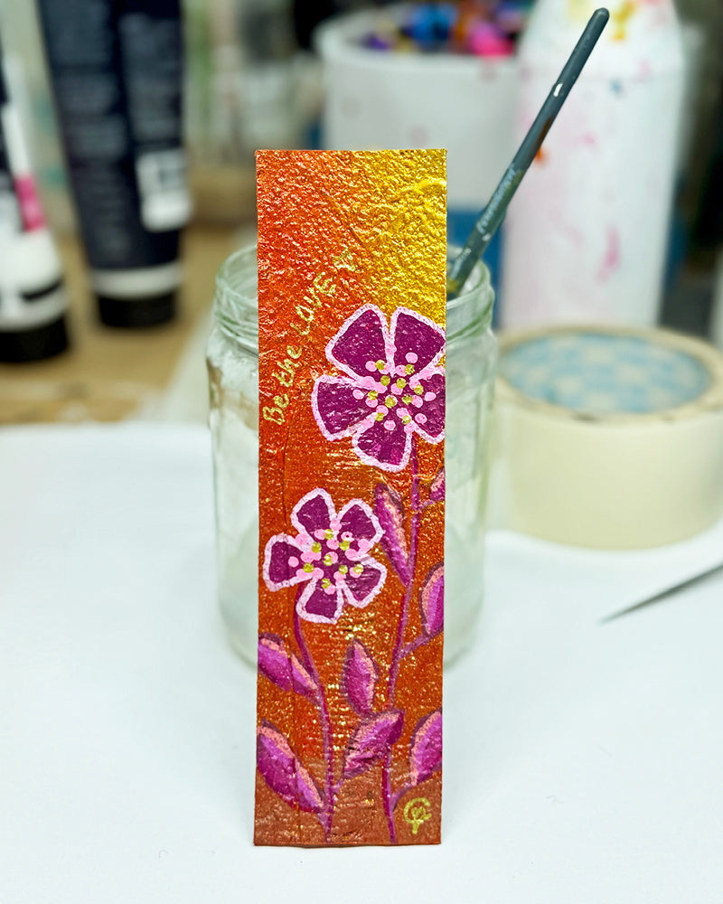 Ett litet konstverk i bokmärkesform. Det här bokmärket är skapat av överblivna bitar canvas från min ateljé, handmålat och dekorerat med akrylfärg. Varje bokmärke är helt unikt och bär spår av det större skapandet – små fragment av målningar, nyanser och energi.