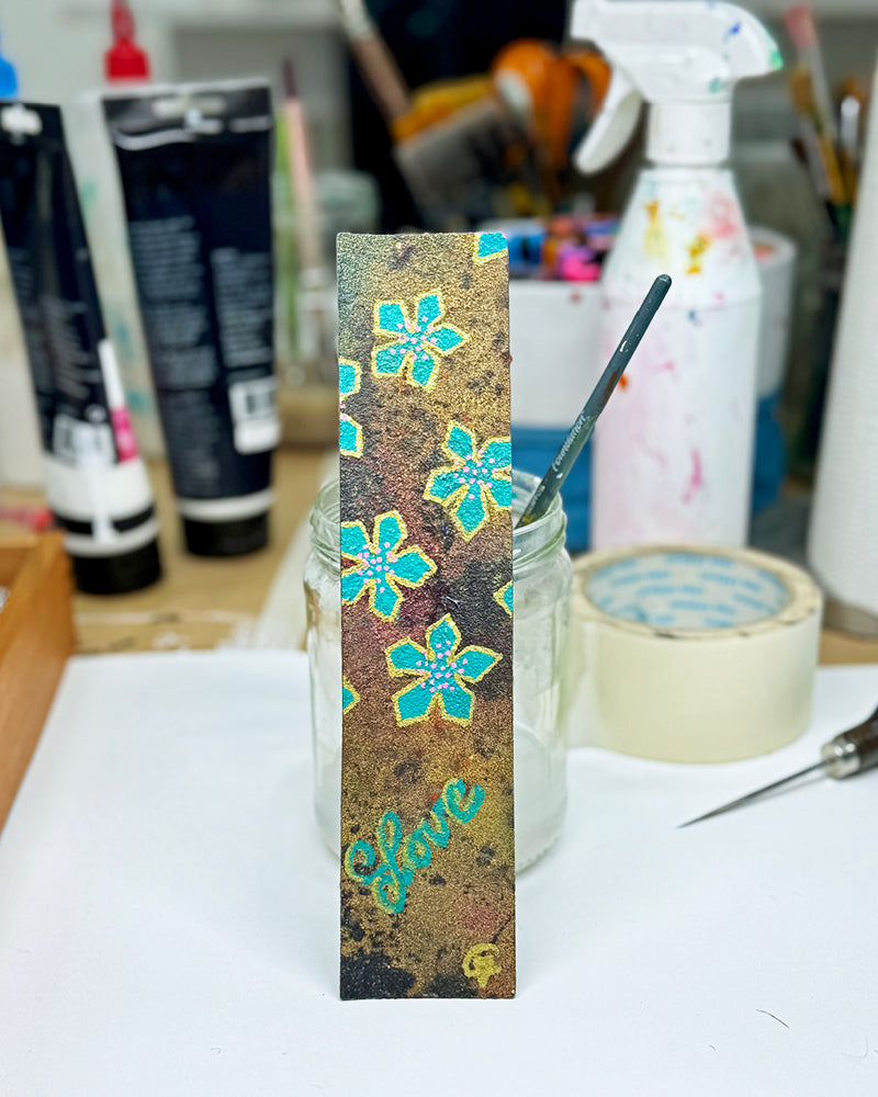 Ett litet konstverk i bokmärkesform. Det här bokmärket är skapat av överblivna bitar canvas från min ateljé, handmålat och dekorerat med akrylfärg. Varje bokmärke är helt unikt och bär spår av det större skapandet – små fragment av målningar, nyanser och energi.
