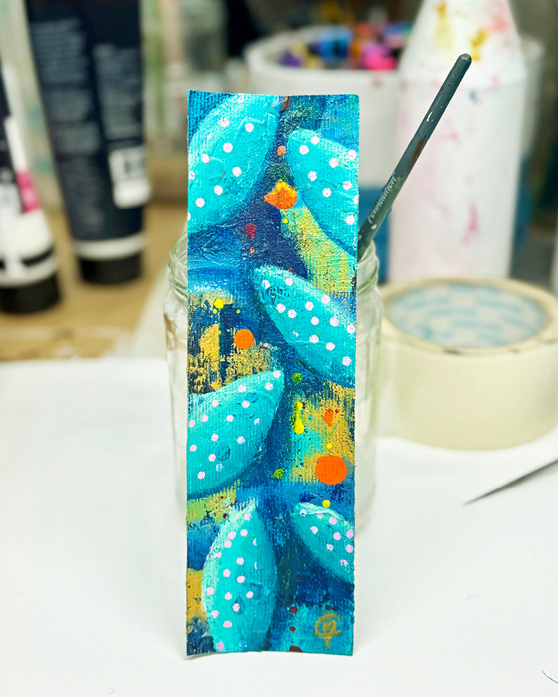 Ett litet konstverk i bokmärkesform. Det här bokmärket är skapat av överblivna bitar canvas från min ateljé, handmålat och dekorerat med akrylfärg. Varje bokmärke är helt unikt och bär spår av det större skapandet – små fragment av målningar, nyanser och energi.
