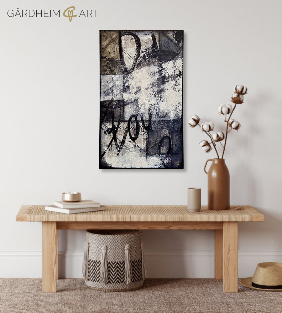 Med akryl, blandteknik och många olika verktyg skapar jag textur och djup, som en dans mellan styrka och sårbarhet. Lager på lager-teknik och transparens låter det underliggande, dolda anas – så som jag ofta känner av det som inte alltid är uppenbart för andra. Jag inspireras av råa och slitna ytor, som i gamla hus och industriella miljöer, och omfamnar svärtan, det trasiga och sårbara, som så ofta gömmer djup skönhet.