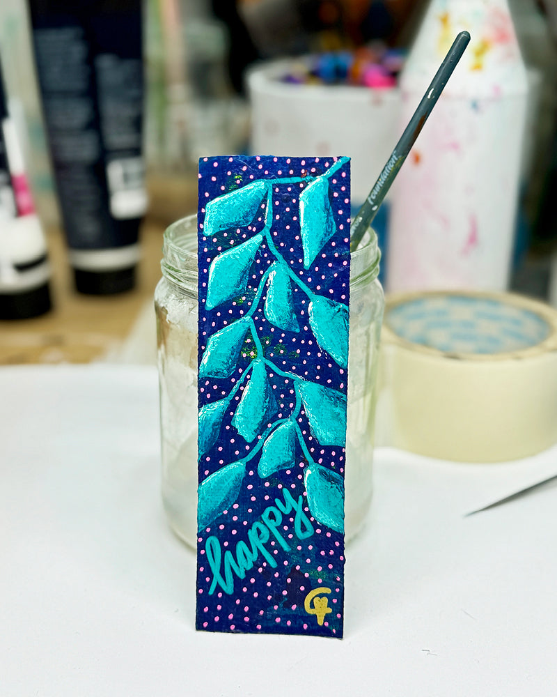Ett litet konstverk i bokmärkesform. Det här bokmärket är skapat av överblivna bitar canvas från min ateljé, handmålat och dekorerat med akrylfärg. Varje bokmärke är helt unikt och bär spår av det större skapandet – små fragment av målningar, nyanser och energi.
