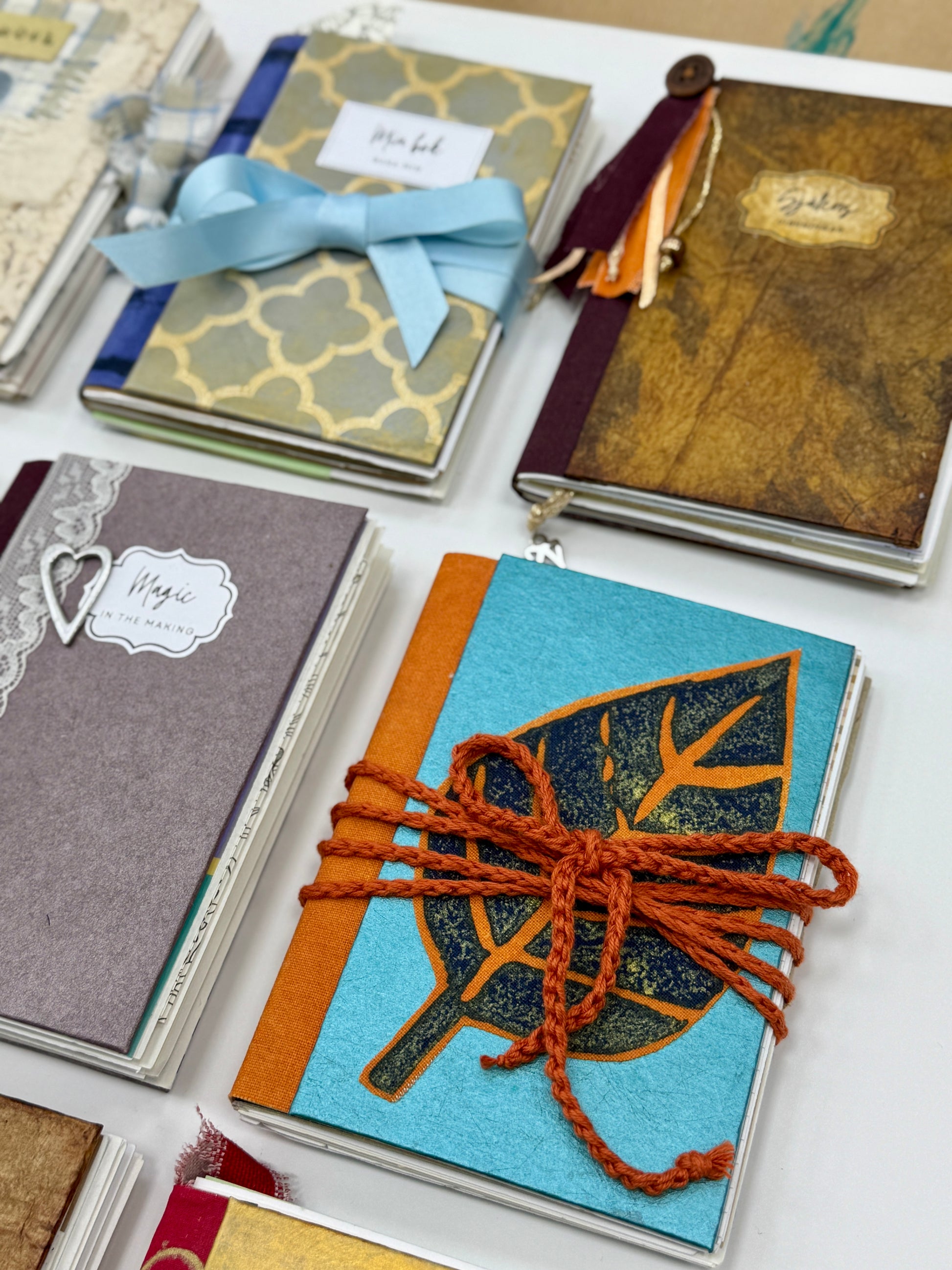 En helt unik anteckningsbok av återvunnet & återfunnet material som gamla kuvert, brev, böcker, tygbitar, snören, tapetprover, smycken och annat, valt med hjärtat och omvandlat till något nytt, vackert och meningsfullt.