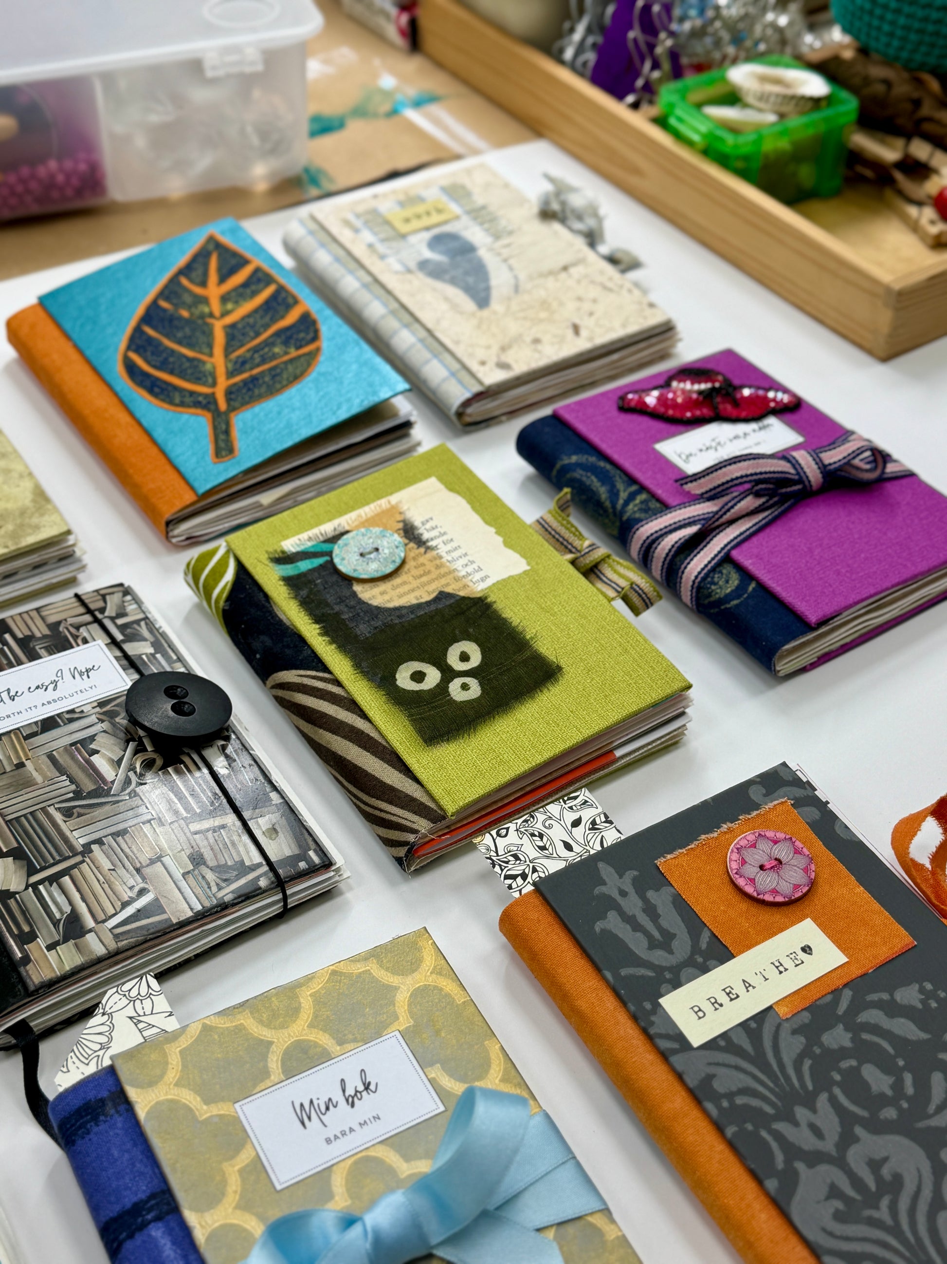 En helt unik anteckningsbok av återvunnet & återfunnet material som gamla kuvert, brev, böcker, tygbitar, snören, tapetprover, smycken och annat, valt med hjärtat och omvandlat till något nytt, vackert och meningsfullt.