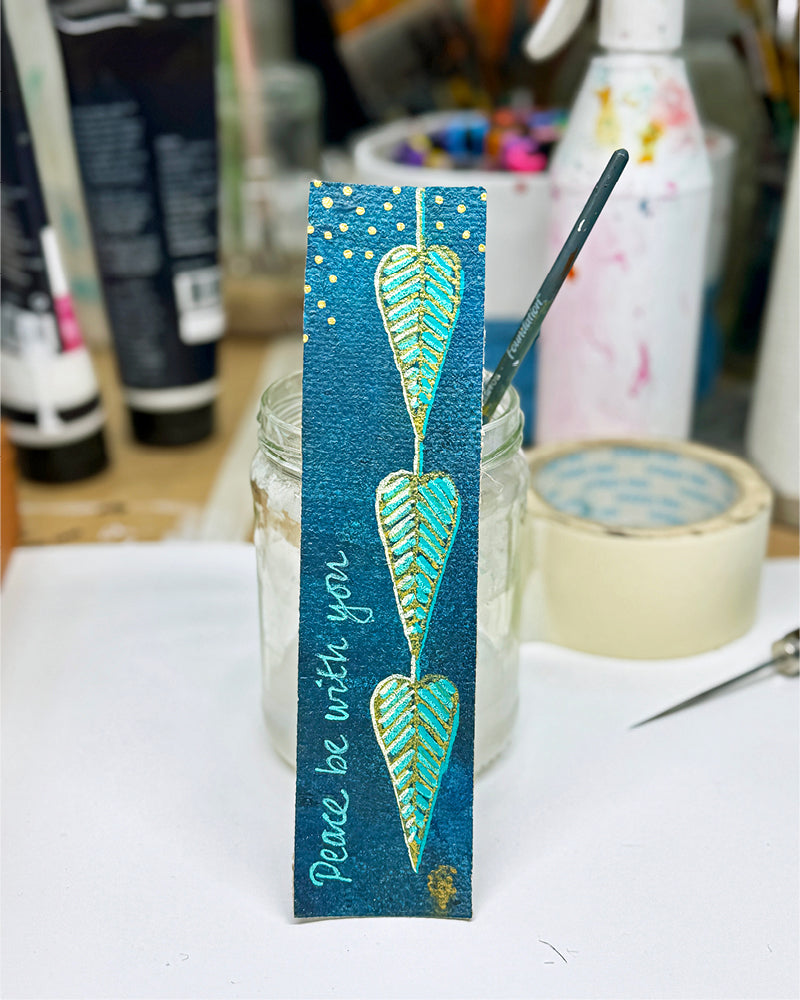 Ett litet konstverk i bokmärkesform. Det här bokmärket är skapat av överblivna bitar canvas från min ateljé, handmålat och dekorerat med akrylfärg. Varje bokmärke är helt unikt och bär spår av det större skapandet – små fragment av målningar, nyanser och energi.