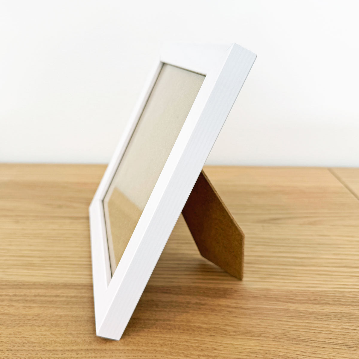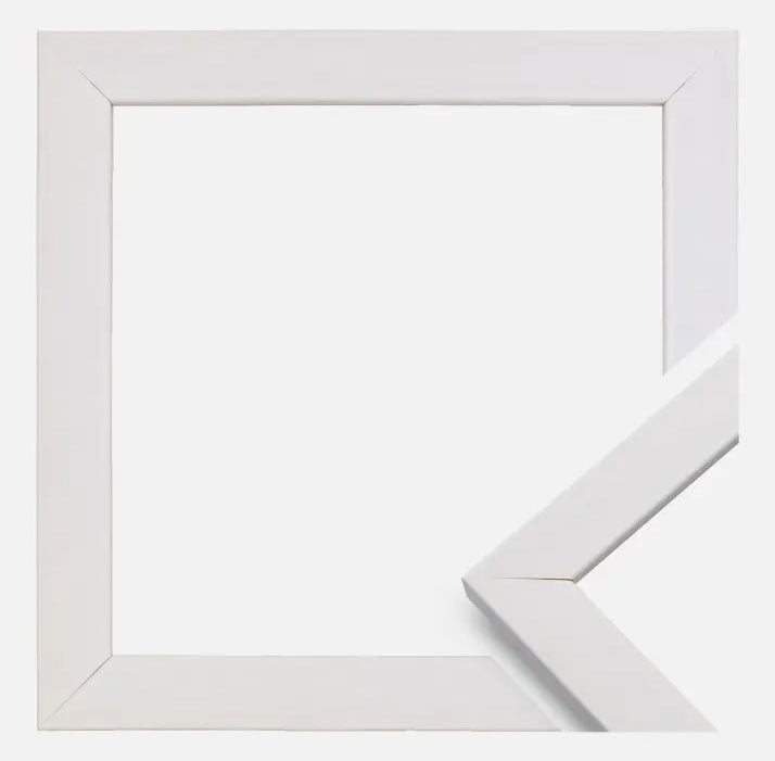 Vit, matt träram i trä med lätt rundad profil och riktigt glas.
