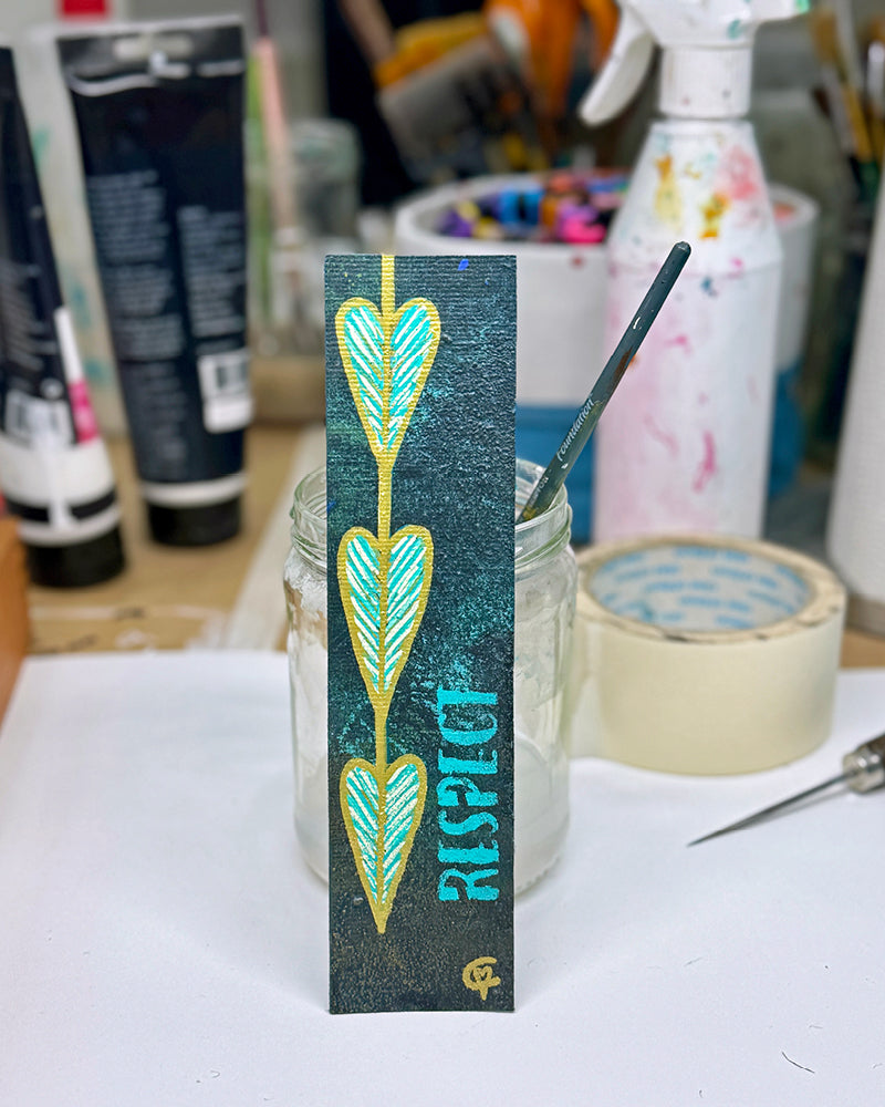 Ett litet konstverk i bokmärkesform. Det här bokmärket är skapat av överblivna bitar canvas från min ateljé, handmålat och dekorerat med akrylfärg. Varje bokmärke är helt unikt och bär spår av det större skapandet – små fragment av målningar, nyanser och energi.