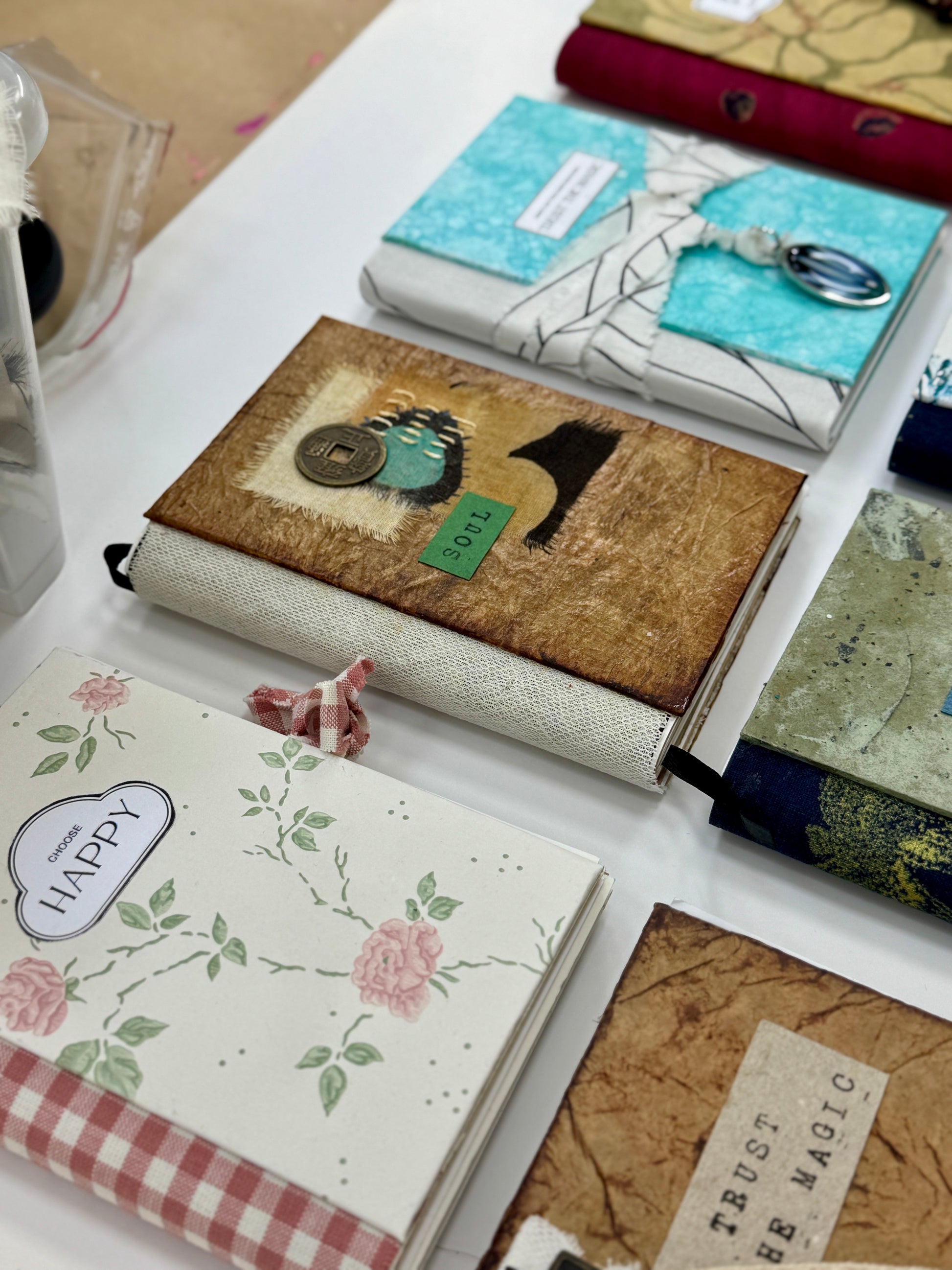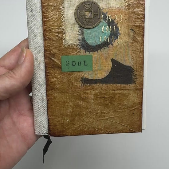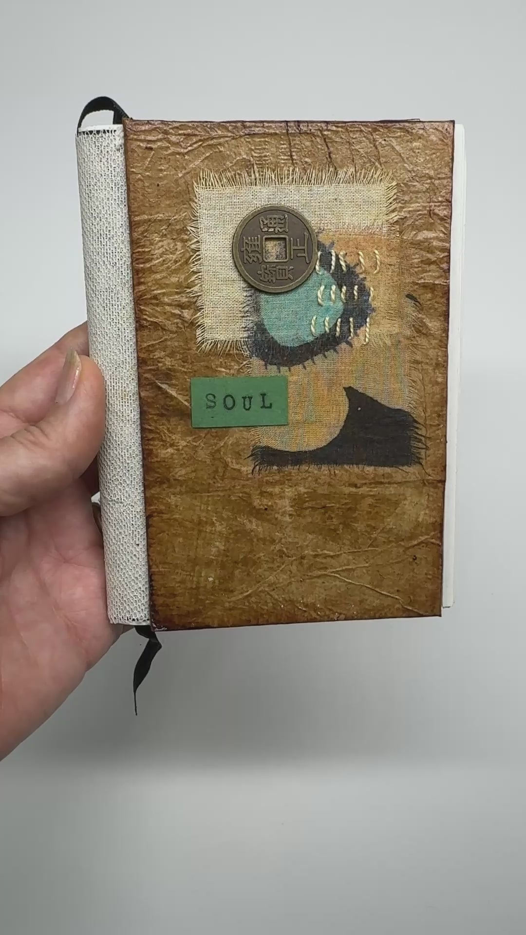 En helt unik anteckningsbok av återvunnet & återfunnet material som gamla kuvert, brev, böcker, tygbitar, snören, tapetprover, smycken och annat, valt med hjärtat och omvandlat till något nytt, vackert och meningsfullt.