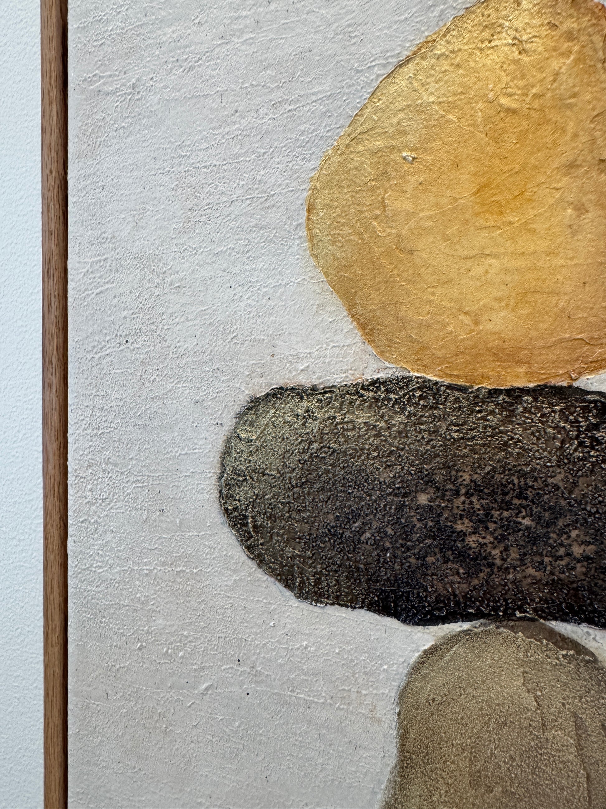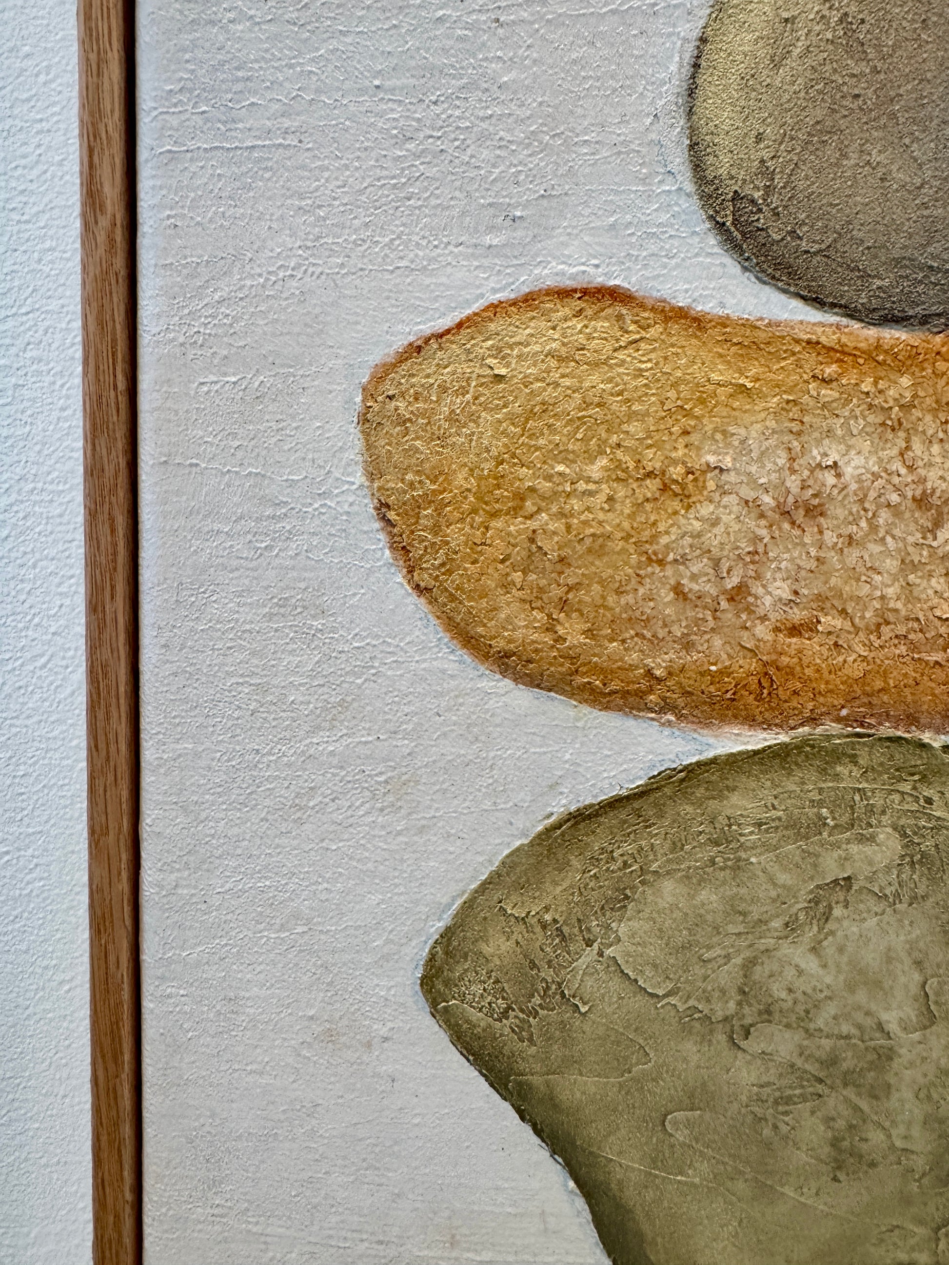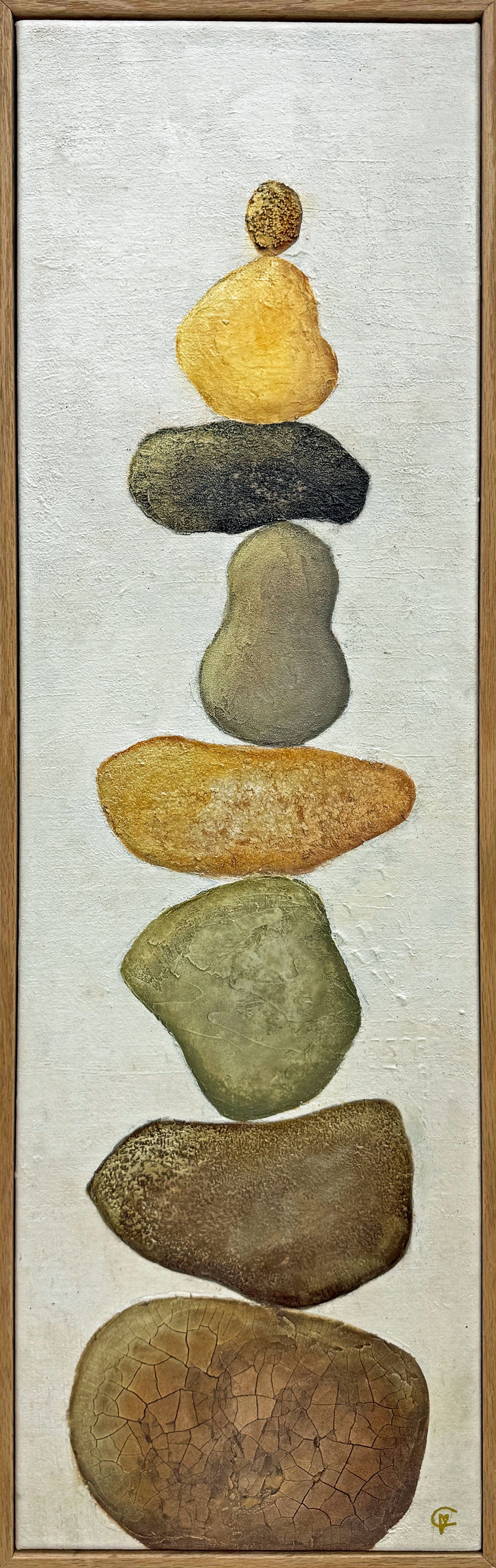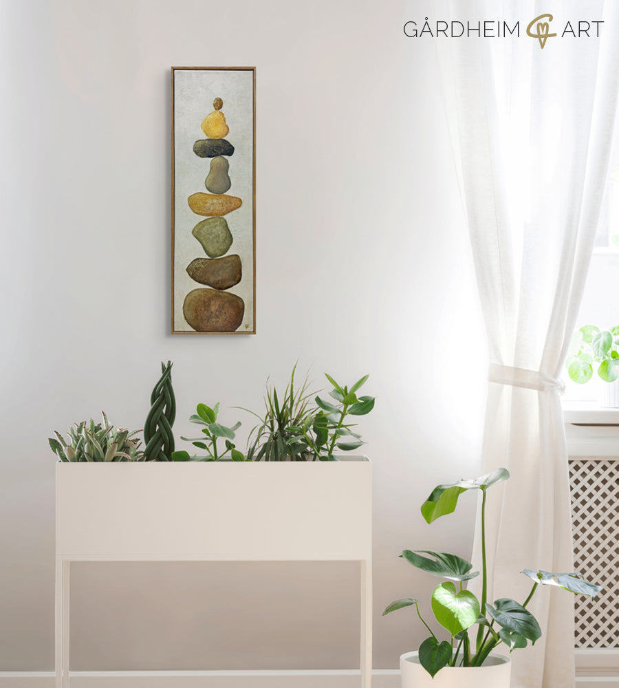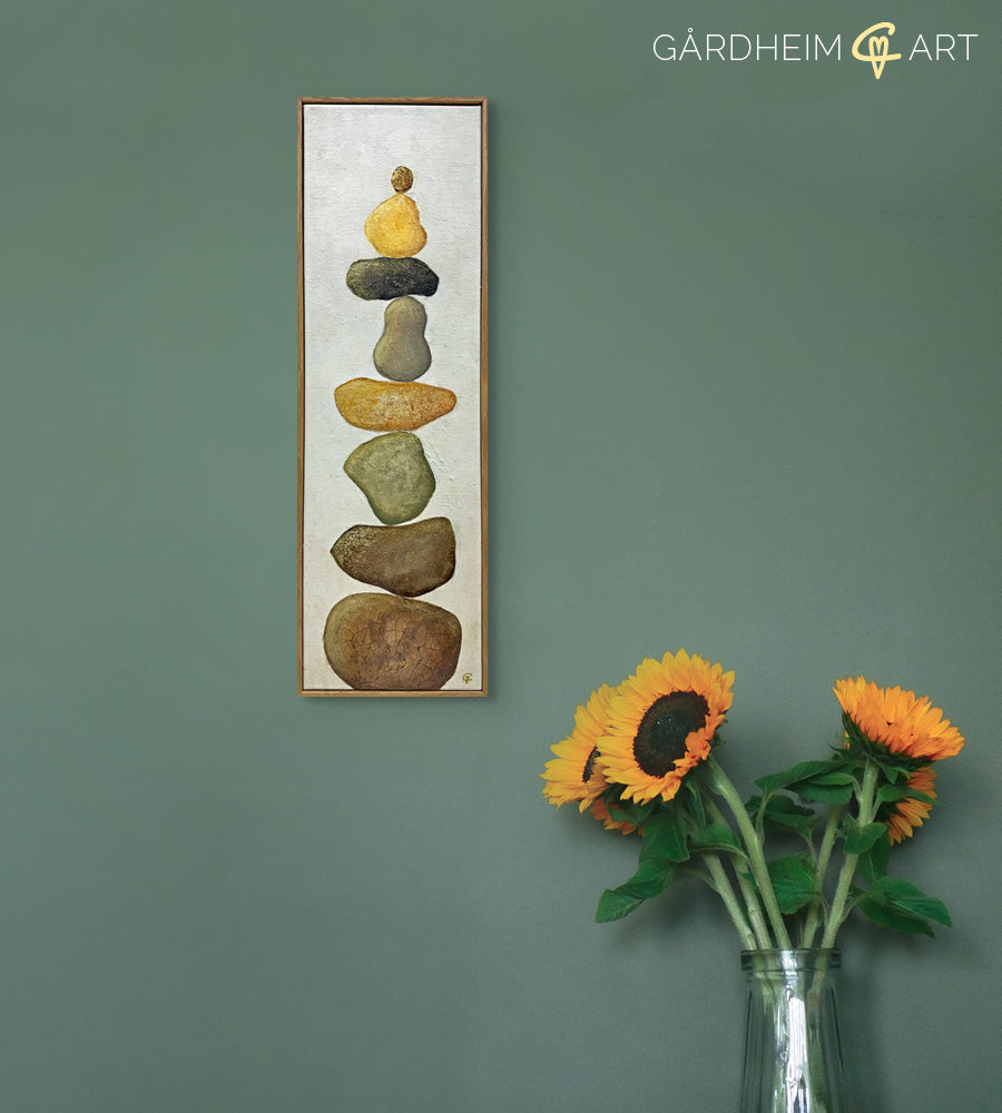 För mig handlar den här målningen om att våga släppa taget – om kontrollen, om tvivlet, om det vi inte kan veta i förväg. Stenarna reser sig i en orimligt hög, nästan omöjlig stapel, ändå står de där i en självklar, tyst balans.